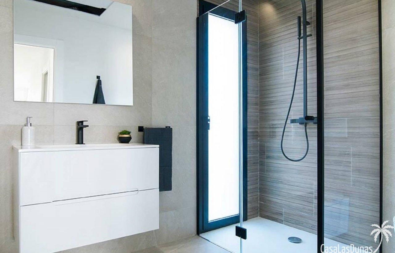Dieses Projekt wird auf Grundstücken mit einer durchschnittlichen Größe von 435 Quadratmetern gebaut und liegt 200 Meter von einem Supermarkt, Restaurants und Bars entfernt. Wir finden diese geräumigen Villen mit 4 Schlafzimmern in La Herrada, Los Montesinos. Jede Immobilie verfügt über einen privaten Swimmingpool mit einer Größe von vier mal acht Metern. Beim Betreten der Villa finden Sie im Flur einen Schrank für Ihre Mäntel. Danach finden wir eine offene Küche, ein Esszimmer und ein Wohnzimmer. Die großen Fenster lassen viel Licht in das Haus. Hinter der Küche finden Sie zwei geräumige Doppelschlafzimmer, ein Badezimmer und einen praktischen Hauswirtschaftsraum unter der Treppe zum ersten Stock. Im ersten Stock finden Sie die beiden anderen Schlafzimmer, beide mit eigenem Bad. Sie haben auch Zugang zur 30 Quadratmeter großen Dachterrasse, von wo aus Sie einen herrlichen Blick auf die private Terrasse, den Garten und die Umgebung, einschließlich des Salzsees von Torrevieja und der natürlichen Lagune, haben. Obwohl die Standardvilla über vier Schlafzimmer verfügt, besteht die Möglichkeit, eines herauszunehmen, um einen größeren Küchen-, Ess- und Wohnbereich zu nutzen. Zögern Sie nicht, uns für weitere Informationen oder zusätzliche Fotos zu kontaktieren.