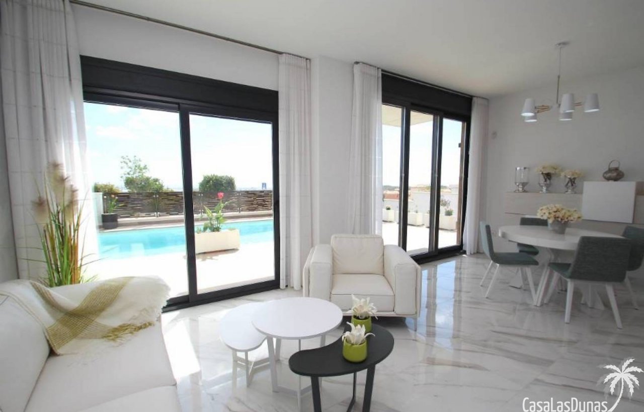 Die Residenz liegt nur 400 Meter vom Strand entfernt. Ein großer Supermarkt ist in der Nähe. Das gleiche Modell kann für 749.000 € auch an Land 10 km von der Küste entfernt gebaut werden. Im Preis inbegriffen: Fußbodenheizung in den Bädern sowie sämtliche Innen- und Außenbeleuchtung im Haus. Der Bau der Villa dauert ca. 12 Monate nach Vertragsunterzeichnung. Möchten Sie weitere Informationen zu dieser wunderschönen Villa? Kontaktieren Sie uns bald! *Weitere Informationen zur Gegend: Das Zentrum von Orihuela Costa bietet eine lebendige Mischung aus Geschäften, Restaurants und Cafés. Besonders abends können Besucher die lebhafte Atmosphäre genießen. Dort finden regelmäßig Märkte und lokale Veranstaltungen statt, was den Ort zu einem attraktiven Standort für Einwohner und Touristen macht. Die Region um Orihuela Costa zeichnet sich durch wunderschöne Strände und malerische Landschaften aus. Naturliebhaber können Wander- und Radwege entlang der Küste genießen. Darüber hinaus gibt es in der Nähe Golfplätze und Naturschutzgebiete, was die Gegend ideal zum aktiven Entspannen und Erkunden der mediterranen Flora und Fauna macht.