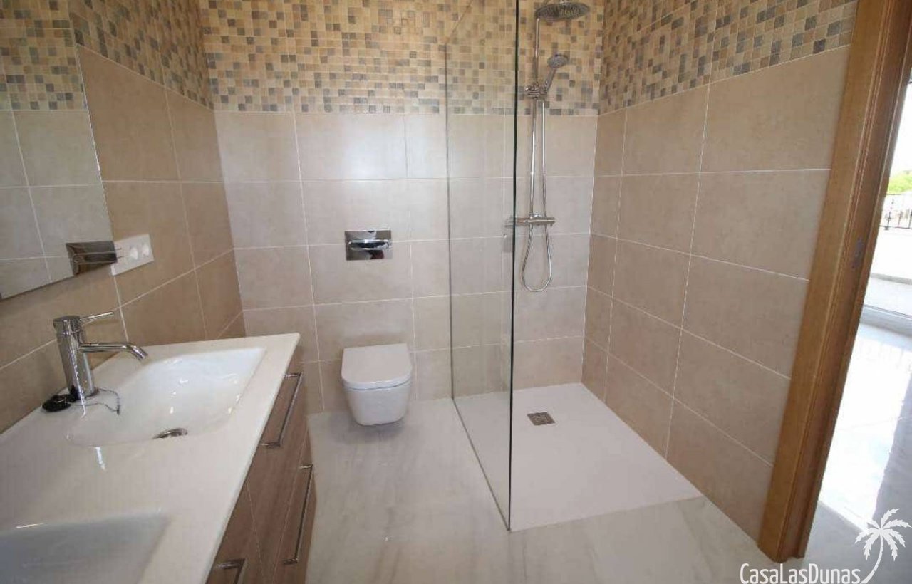 In allen Schlafzimmern, im Wohnzimmer und in der Küche ist eine Klimaanlage vorinstalliert. Die Badezimmer verfügen über eine Toilette, eine Dusche, eine Glaswand und Badmöbel.