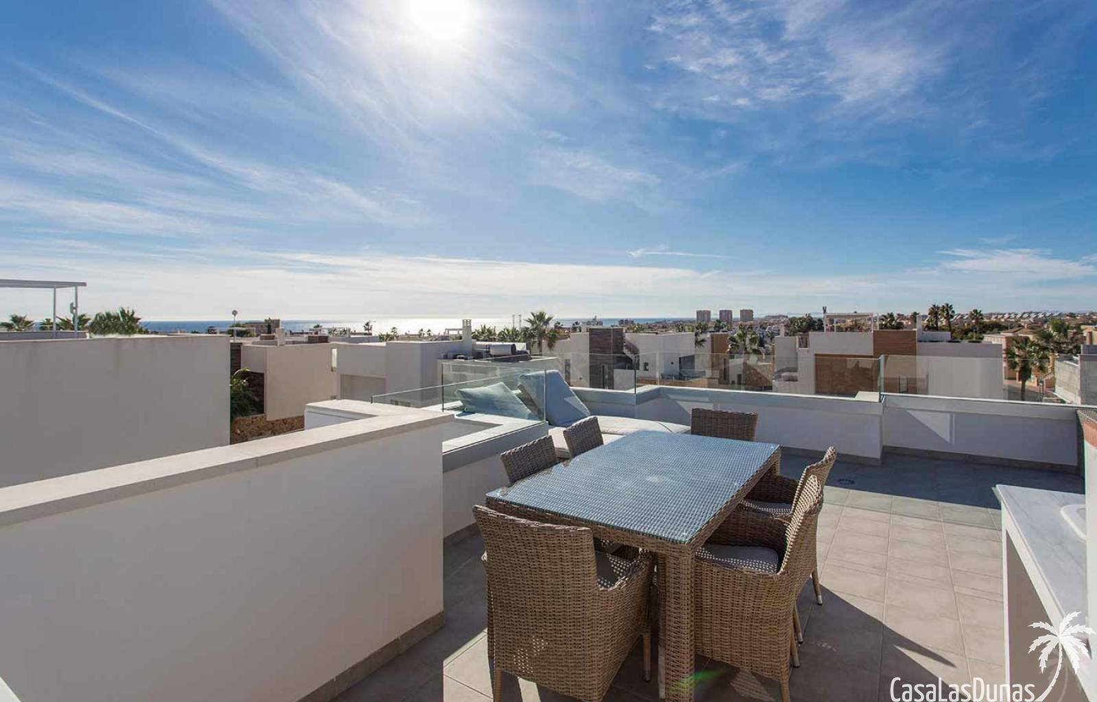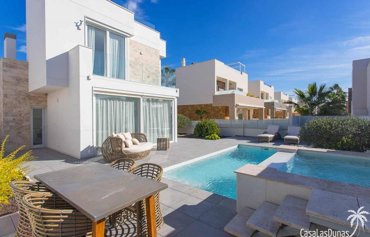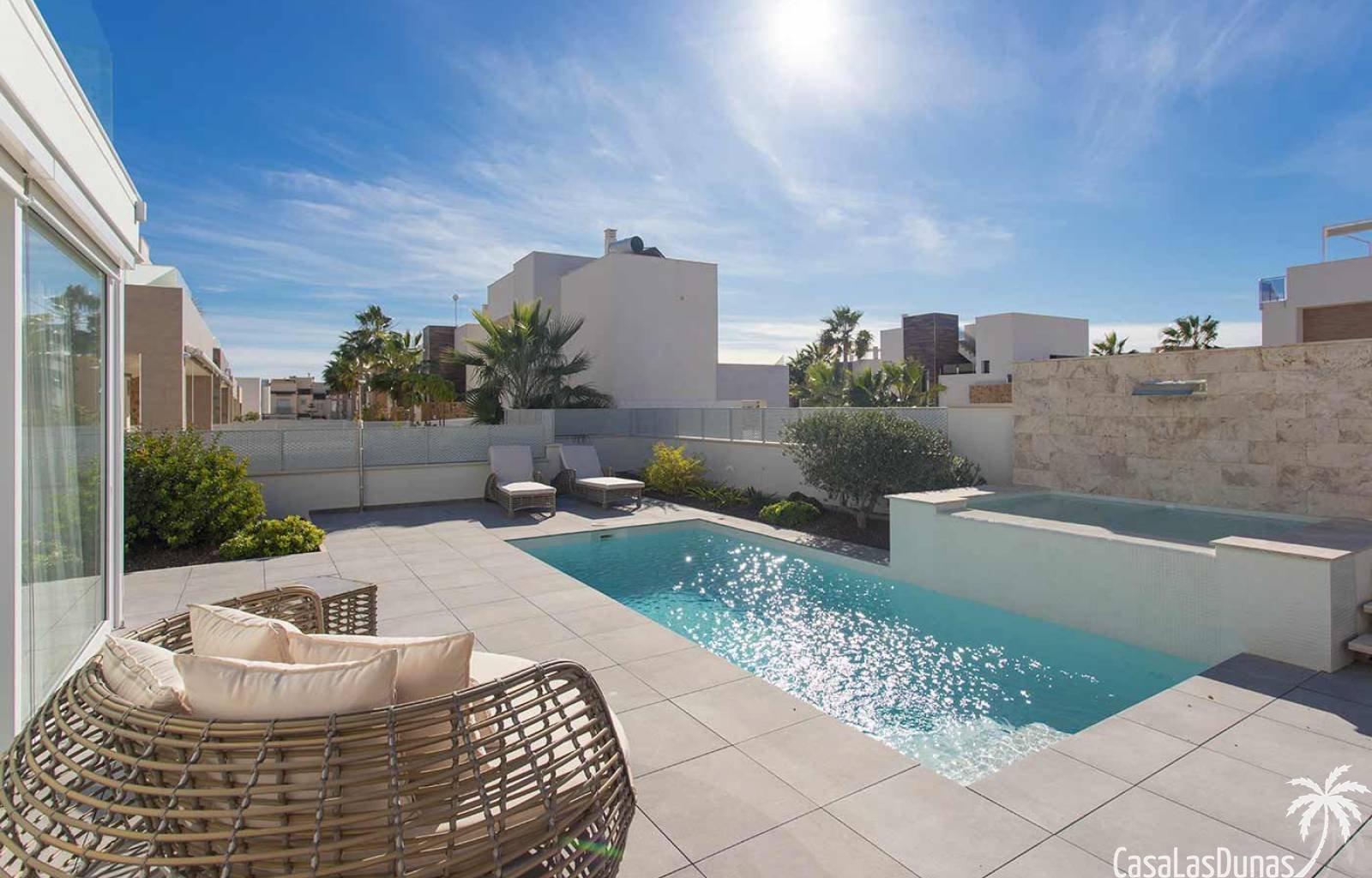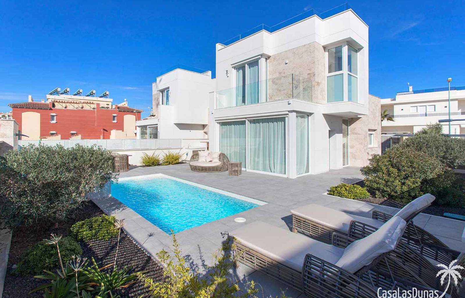 Diese wunderschönen neuen Villen liegen nur 500 Meter vom Strand entfernt. Bei diesem Projekt werden 3 Villen auf 289 m² Grundstück gebaut. Die drei Häuser haben eine Wohnfläche von 144 m² und verfügen über 3 Schlafzimmer, 2 Badezimmer, ein Wohn-/Esszimmer, eine offene Küche, eine großzügige Terrasse mit privatem Pool und eine 36 m² große Dachterrasse. Die Häuser werden fertiggestellt und schlüsselfertig geliefert. Die Besonderheit dieser Gelegenheit besteht darin, dass die Villen in Strandnähe liegen und diese Kombination in Torrevieja selten und wertvoll ist. Wir haben noch mehr Fotos im Büro! Zögern Sie nicht, uns zu kontaktieren. *Weitere Informationen zu Torrevieja: Torrevieja ist eine geschäftige Küstenstadt an der Costa Blanca, die für ihre großartigen Strände wie Playa del Cura und Playa de los Naufragos bekannt ist. Die Stadt verfügt über eine reiche Kultur, einen großen Hafen und eine geschäftige Innenstadt voller Restaurants, Geschäfte und Märkte. Torrevieja ist auch für seine Salzseen bekannt, die eine einzigartige natürliche Umgebung bieten. Mit einem milden mediterranen Klima und einem vielfältigen Freizeitangebot ist es ein beliebtes Reiseziel für Touristen und Daueransässige.