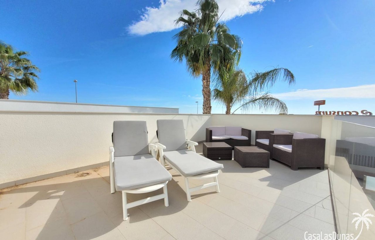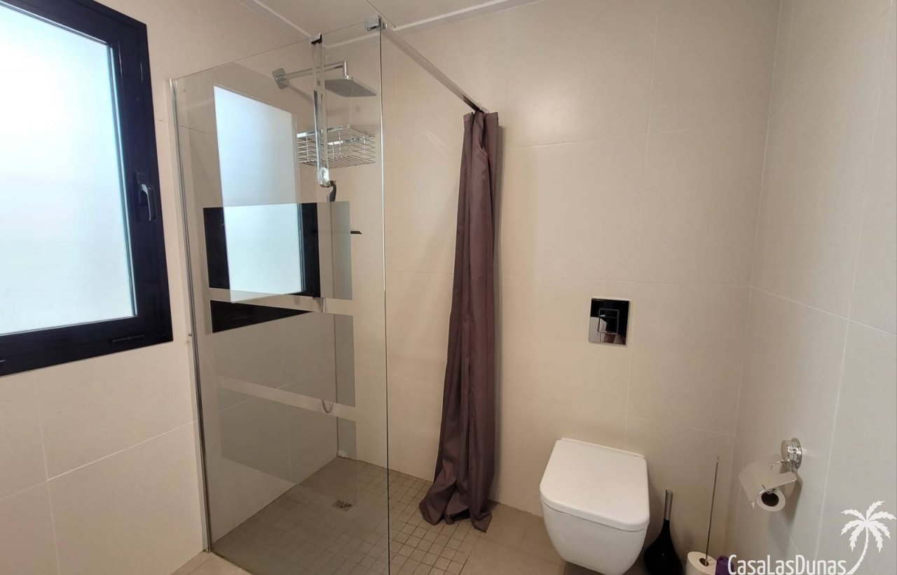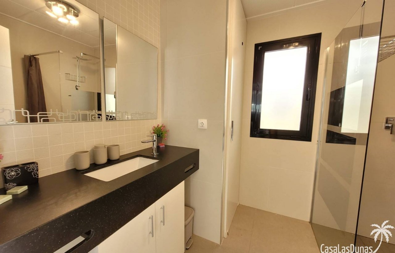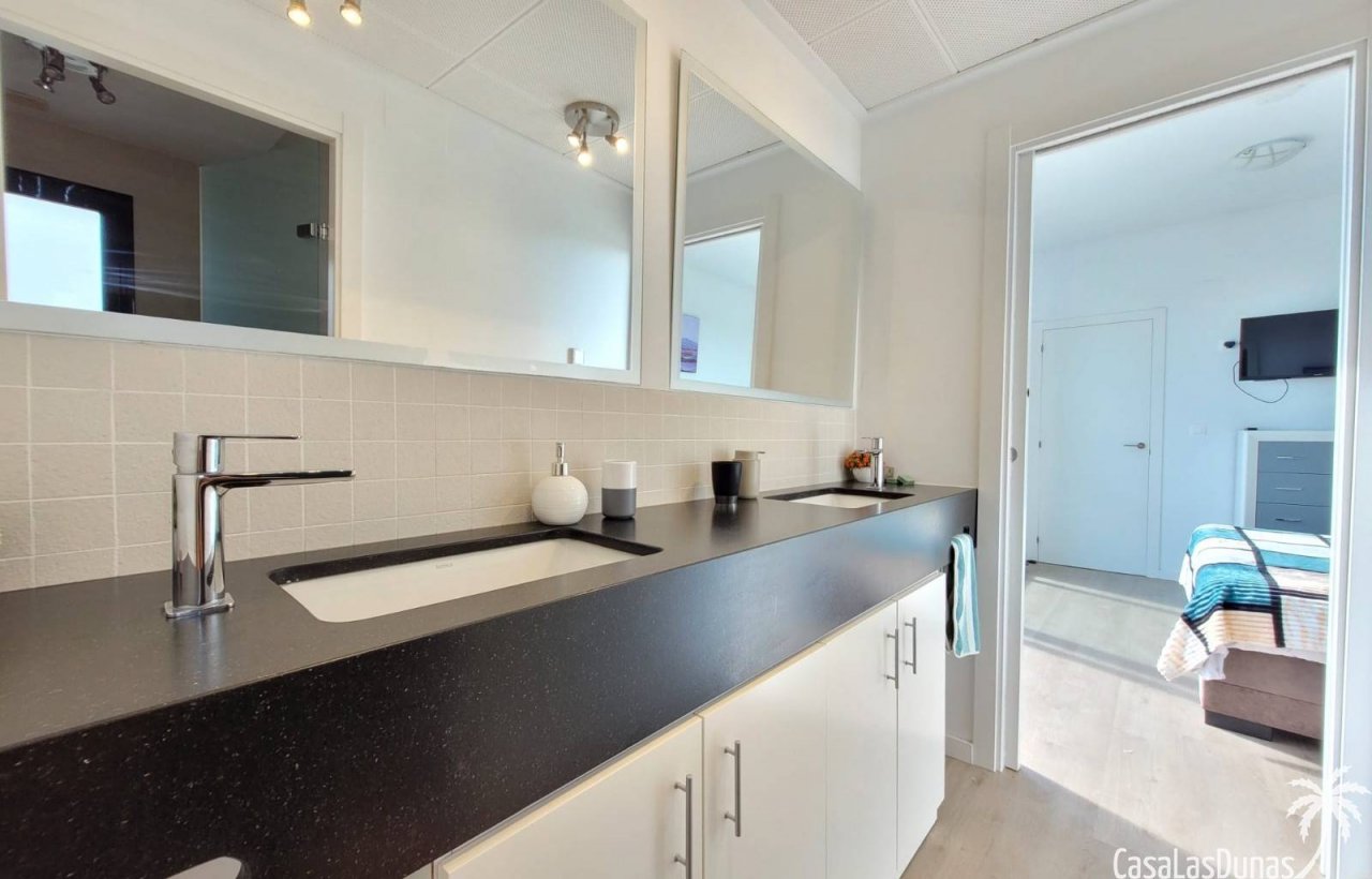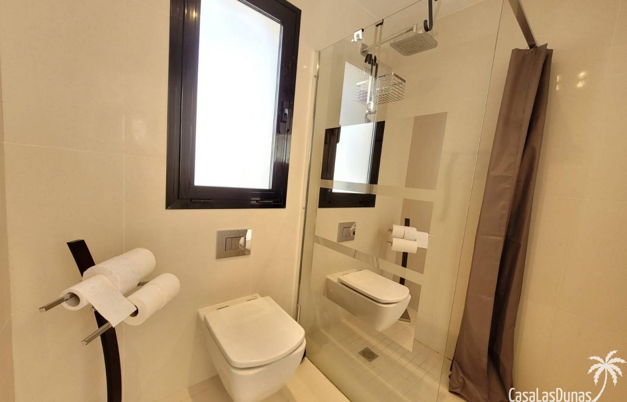 Im Erdgeschoss befinden sich zwei Schlafzimmer, von denen eines durch eine große Glasschiebetür direkten Zugang zum Poolbereich hat. Wenn Sie mit einer größeren Gruppe oder Familie reisen, gibt es im ersten Stock ein weiteres geräumiges Schlafzimmer mit Ankleidezimmer und eigenem Bad. Auf dieser Etage gibt es einen großen Balkon mit Schlafsofa und einem schönen Blick auf die Umgebung und die Salinen von Torrevieja.