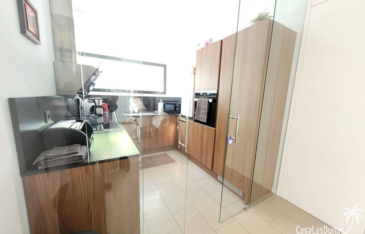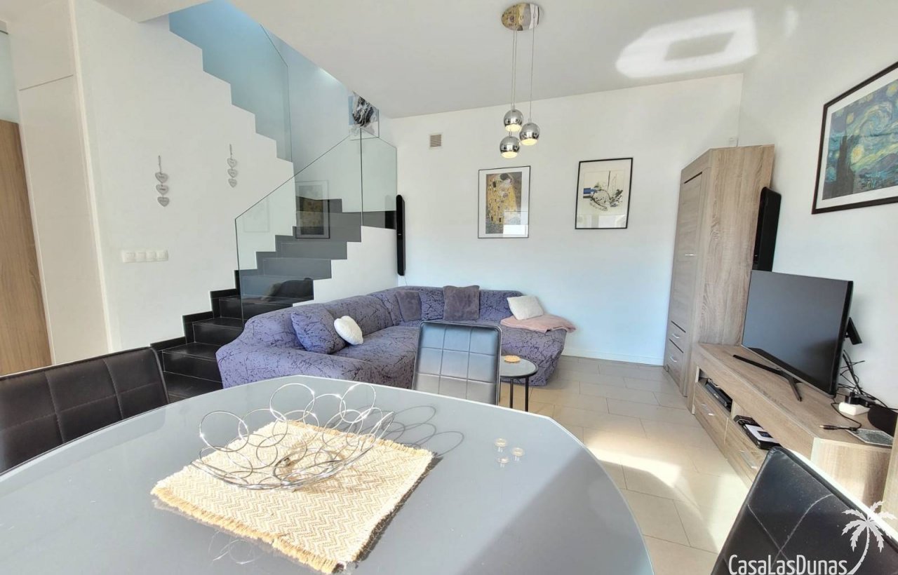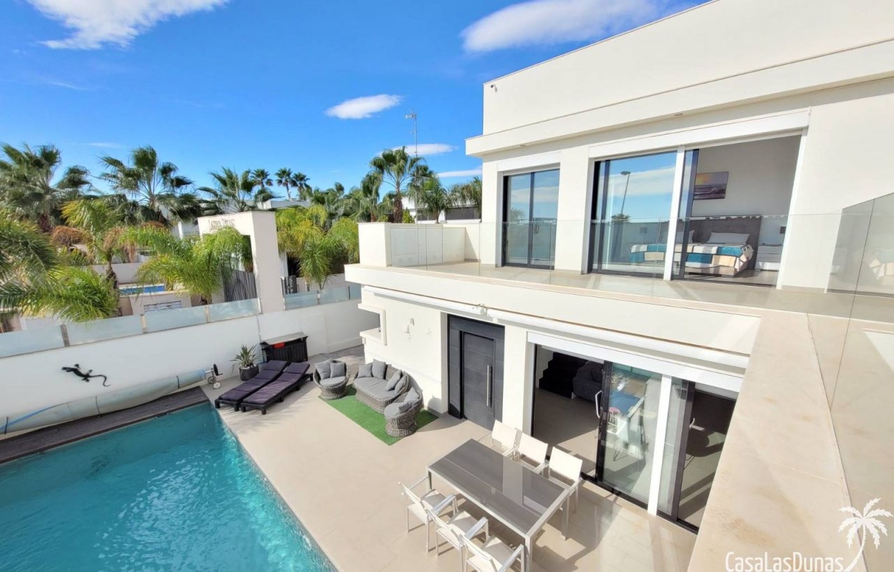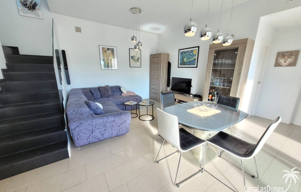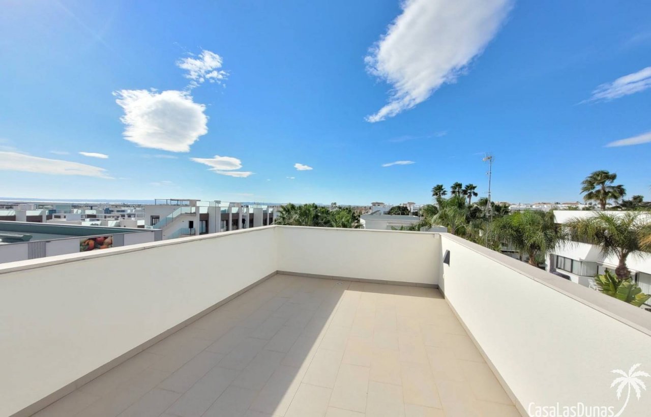 Im Erdgeschoss befinden sich zwei Schlafzimmer, von denen eines durch eine große Glasschiebetür direkten Zugang zum Poolbereich hat. Wenn Sie mit einer größeren Gruppe oder Familie reisen, gibt es im ersten Stock ein weiteres geräumiges Schlafzimmer mit Ankleidezimmer und eigenem Bad. Auf dieser Etage gibt es einen großen Balkon mit Schlafsofa und einem schönen Blick auf die Umgebung und die Salinen von Torrevieja.