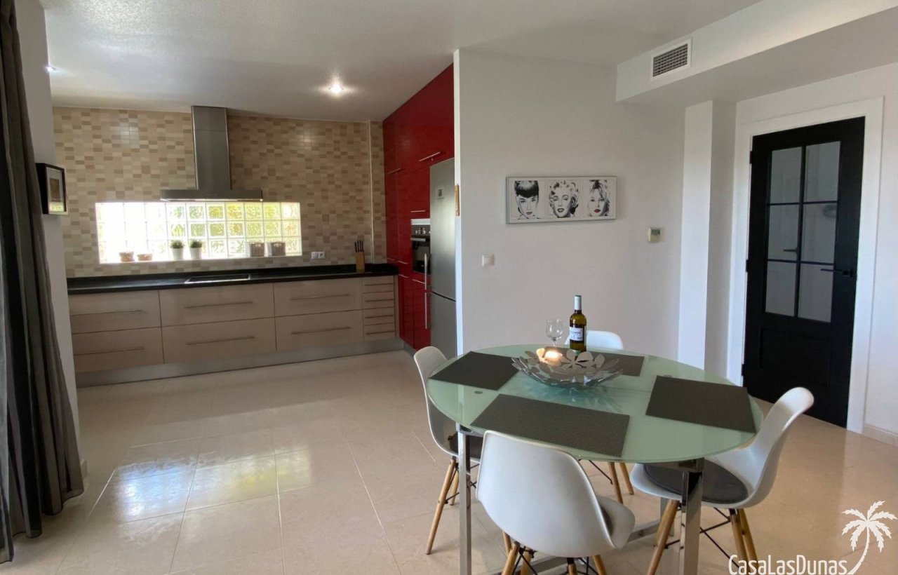 Die Villa El Sueño am Rande von La Marina (San Fulgencio) bietet dank ihrer erhöhten Lage einen luxuriösen Rückzugsort mit atemberaubendem Panoramablick. Die kürzlich renovierte Villa ist geschmackvoll eingerichtet und besticht durch ein elegantes Wohnambiente. Das geräumige und stilvolle Hauptschlafzimmer verfügt über ein eigenes Badezimmer, ebenso wie das zweite Schlafzimmer. Das moderne Wohnzimmer bietet eine gemütliche Entspannungsecke mit Kamin und internationalen Fernsehkanälen.