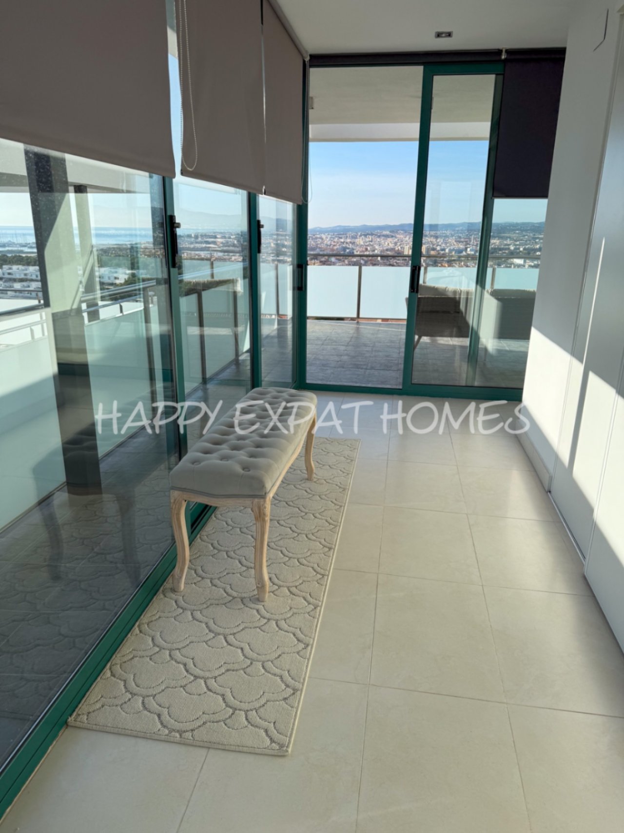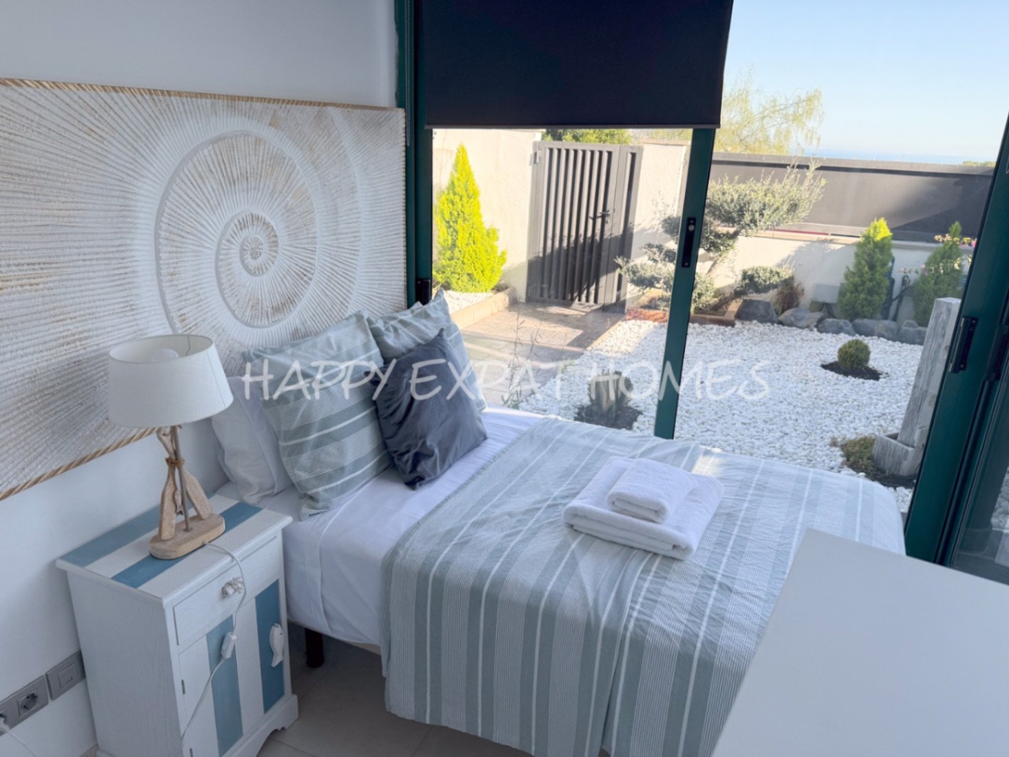 Schlafzimmer 1: Ein Doppelzimmer mit privater Terrasse und herrlichem Blick auf die Bucht von Sitges.