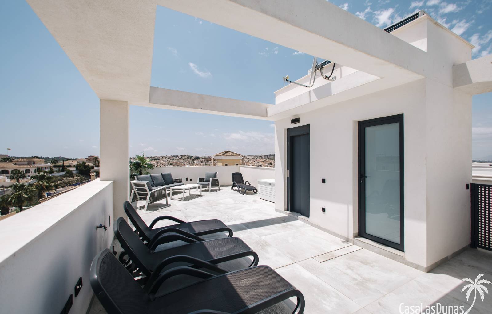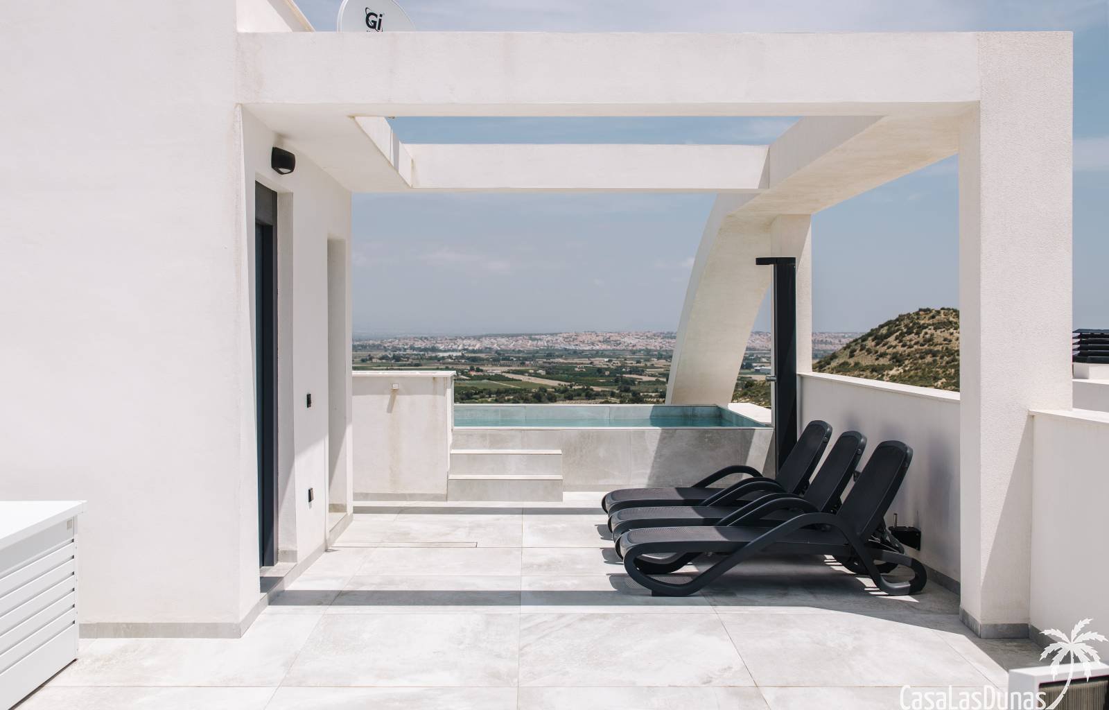 Sie suchen ein großes Haus mit privatem Pool, möchten aber in einer geschlossenen Wohnanlage wohnen? Suchen Sie also nicht weiter: Dieses Projekt ist die Quintessenz aus Raum und Design und befindet sich an einem höheren Punkt im Dorf Rojales, in der Nähe des Golfplatzes Maqrquesa. Die Häuser haben eine einzigartige Raumaufteilung, da Wohnzimmer und Esszimmer/Küche das gesamte Erdgeschoss einnehmen. Dies sorgt für fantastische Ausblicke aus Wohnzimmer und Küche. Vom Wohnzimmer aus gelangen wir auf eine geräumige Terrasse mit einem privaten Swimmingpool für jede Wohnung! Um zu den Zimmern zu gelangen, gehen wir die Innentreppe hinunter. Hier finden wir 4 geräumige Schlafzimmer, 3 Badezimmer, einen Raum für die Waschmaschine und den Boiler und einen Raum, in dem sich die Poolpumpe befindet. Alle Räume verfügen über einen Zugang zu einer Terrasse und bieten somit ausreichend Tageslicht und natürliche Belüftung.…
