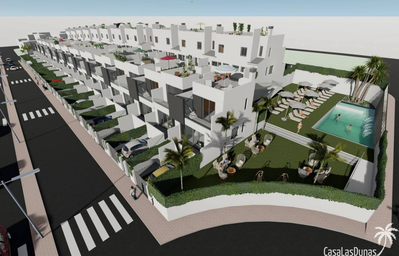 Am Fuße der Sierra de Callosa finden wir diese 44 modernen Doppelhaushälften. Alle Häuser nutzen einen gemeinschaftlichen Swimmingpool und Spielplatz