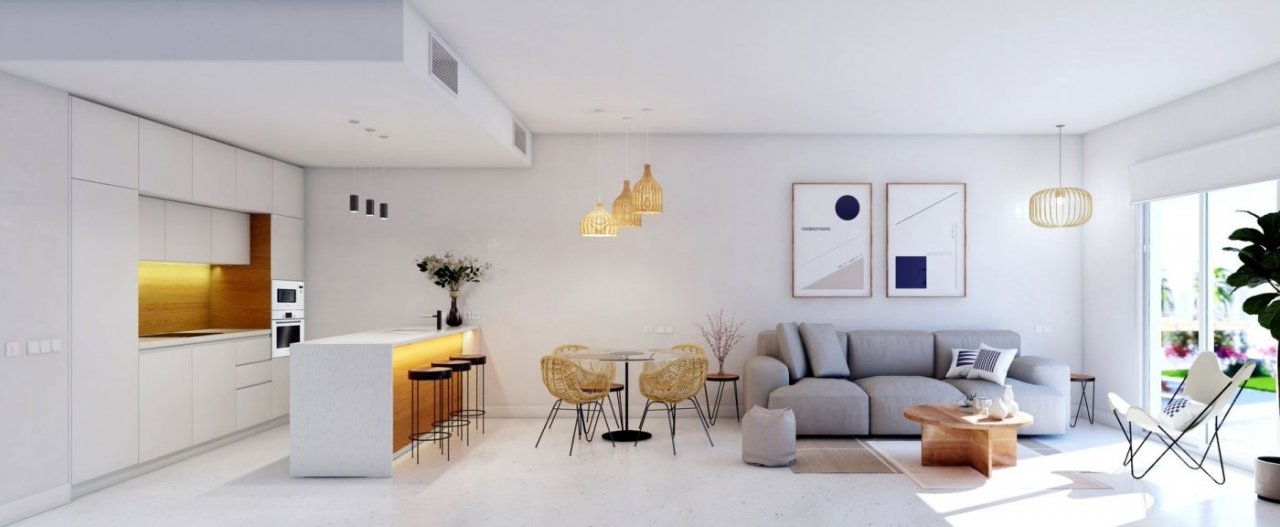 Dieser neue Wohnkomplex mit modernem und minimalistischem Design verfügt über einen schönen Gemeinschaftspool, einen Fitnessraum und ist nur 250 Meter vom Meer entfernt.