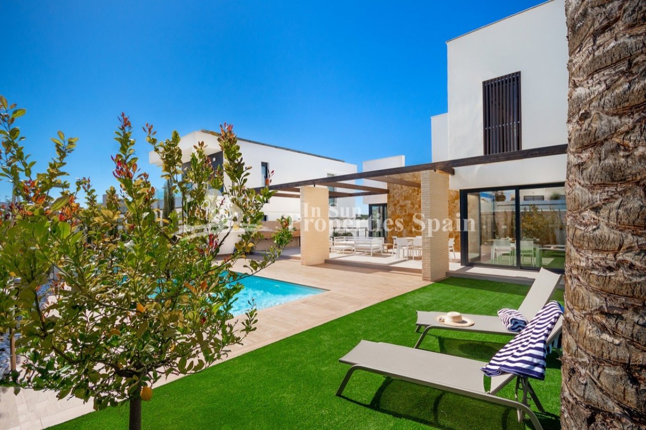 Diese außergewöhnliche, 195 m² große, freistehende Luxusvilla befindet sich auf einem 500 m² großen Grundstück in der prestigeträchtigen Gegend von Campoamor, nur 500 m von den wunderschönen Stränden von Aguamarina entfernt. Die Immobilie verfügt über 4 geräumige Schlafzimmer, 4 moderne Badezimmer, einen privaten Swimmingpool, einen angelegten Garten und eine 59 m² große Sonnenterrasse. Sie ist mit einer aerothermischen Anlage und einer Klimaanlage ausgestattet und bietet Eleganz und modernen Komfort in einer der begehrtesten Küstenlagen von Orihuela Costa.