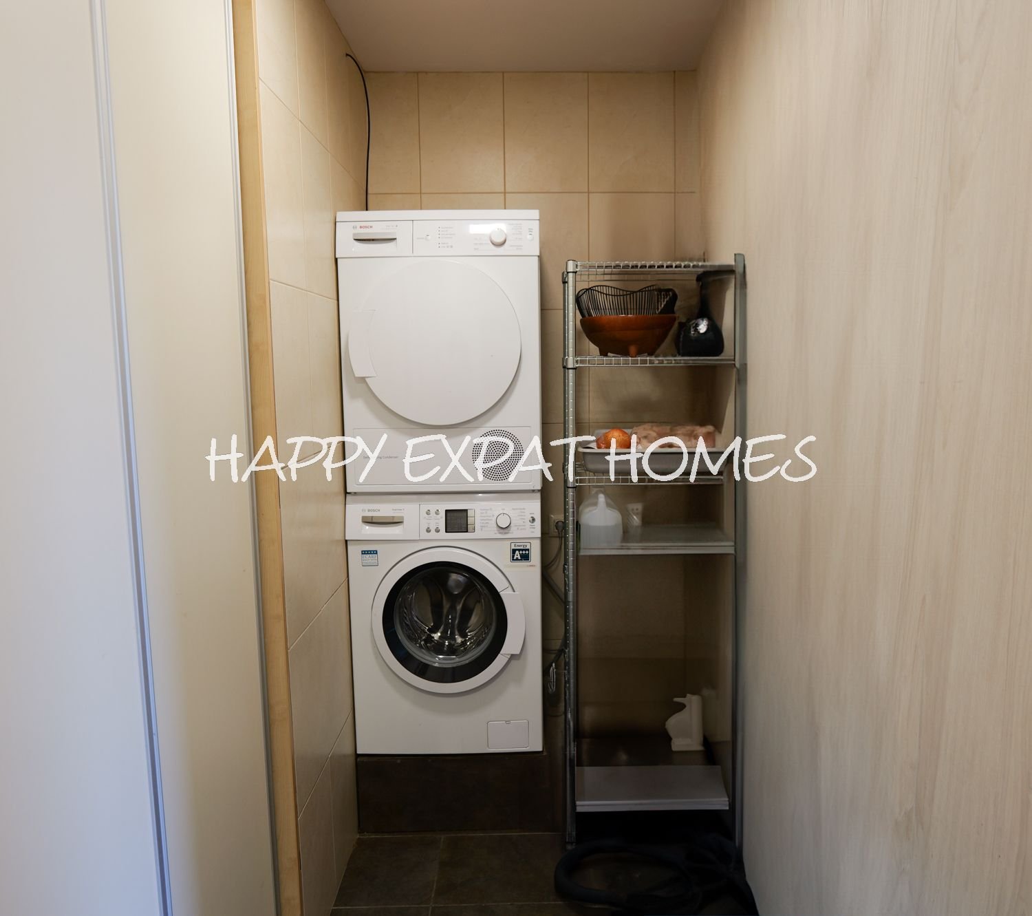 Neben der Küche gibt es einen praktischen Vorratsraum mit Platz für Lagerung, Waschmaschine und Trockner.
