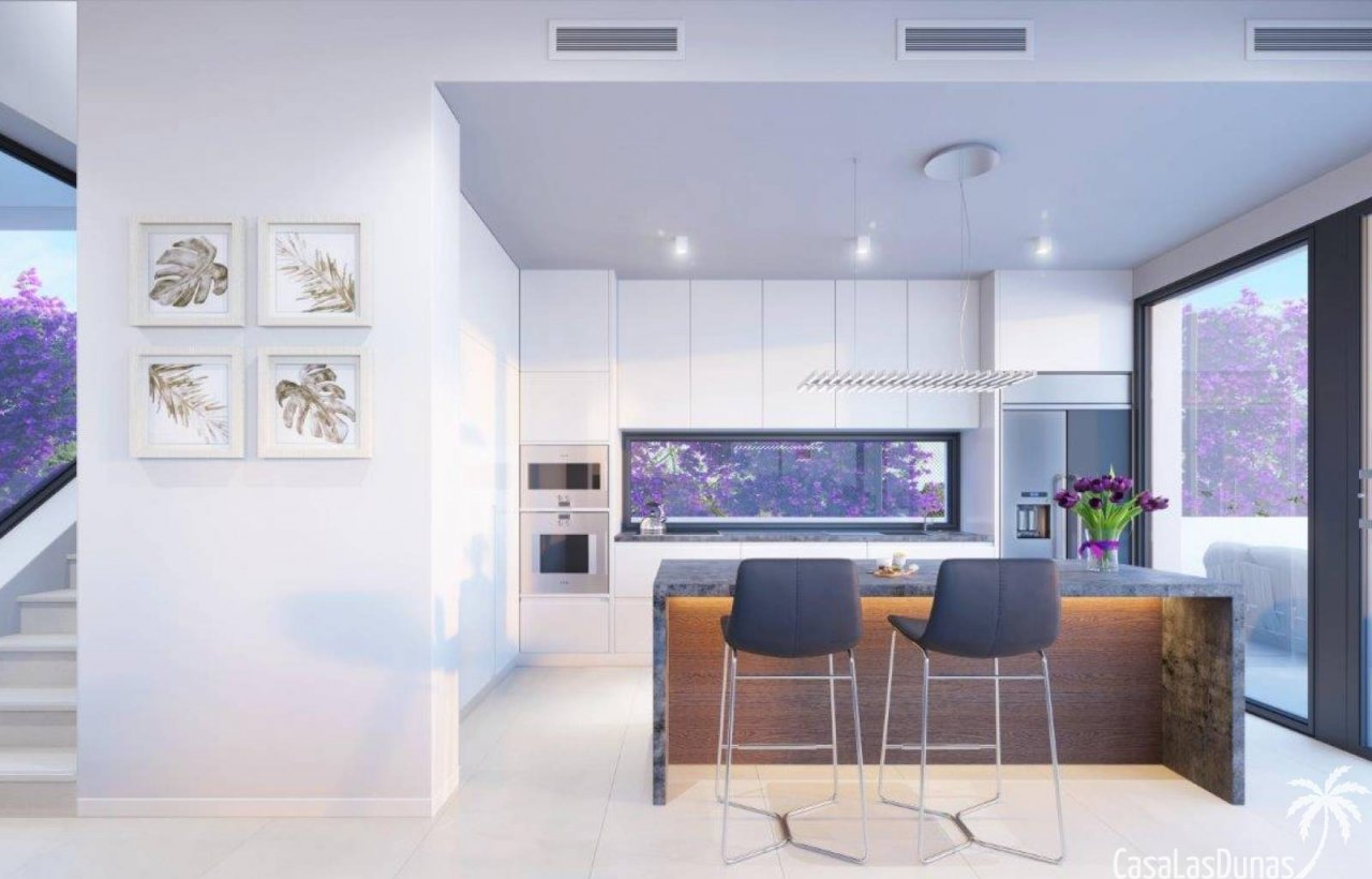 Hinter der Küche führt eine Treppe in den ersten Stock. Hier finden Sie auf der einen Seite eine große Südterrasse mit Blick auf das Mittelmeer und die Umgebung. Auf der anderen Seite finden Sie das Hauptschlafzimmer mit eigenem Bad und einer kleinen Terrasse. Kunden können aus 3 verschiedenen Bodenfliesen, Küchenfarben und Arbeitsplatten wählen – alle von Porcelanosa.