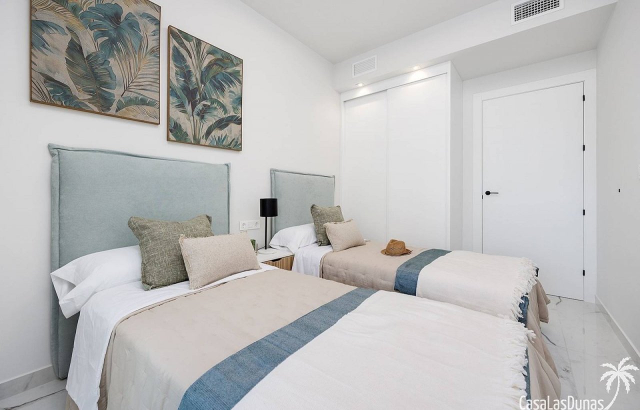 Im sonnigen Torrevieja, nahe der Küste, finden Sie diese modernen, neuen Apartments, die Komfort und Stil vereinen. Jedes Apartment verfügt über ein helles Wohnzimmer mit offener Küche und Kochinsel, zwei Schlafzimmer mit Einbauschränken und zwei Badezimmer, eines davon en-suite. Große Schiebetüren öffnen sich auf eine geräumige private Terrasse, ideal, um die Natur zu genießen. Die Residenz bietet zahlreiche Annehmlichkeiten, darunter einen Swimmingpool mit Whirlpool, ein Wellnesscenter, einen Fitnessraum, Sportplätze, einen Spielplatz und eine sichere Tiefgarage mit Abstellraum. Die Strände sind nur einen Steinwurf entfernt, und Golfbegeisterte können ihre Freizeit auf den vielen nahegelegenen Plätzen genießen.