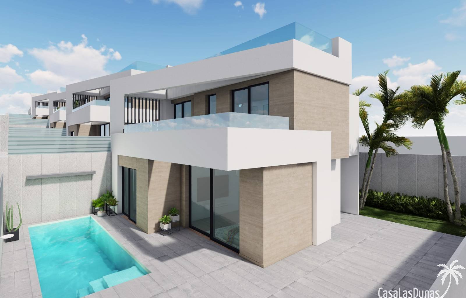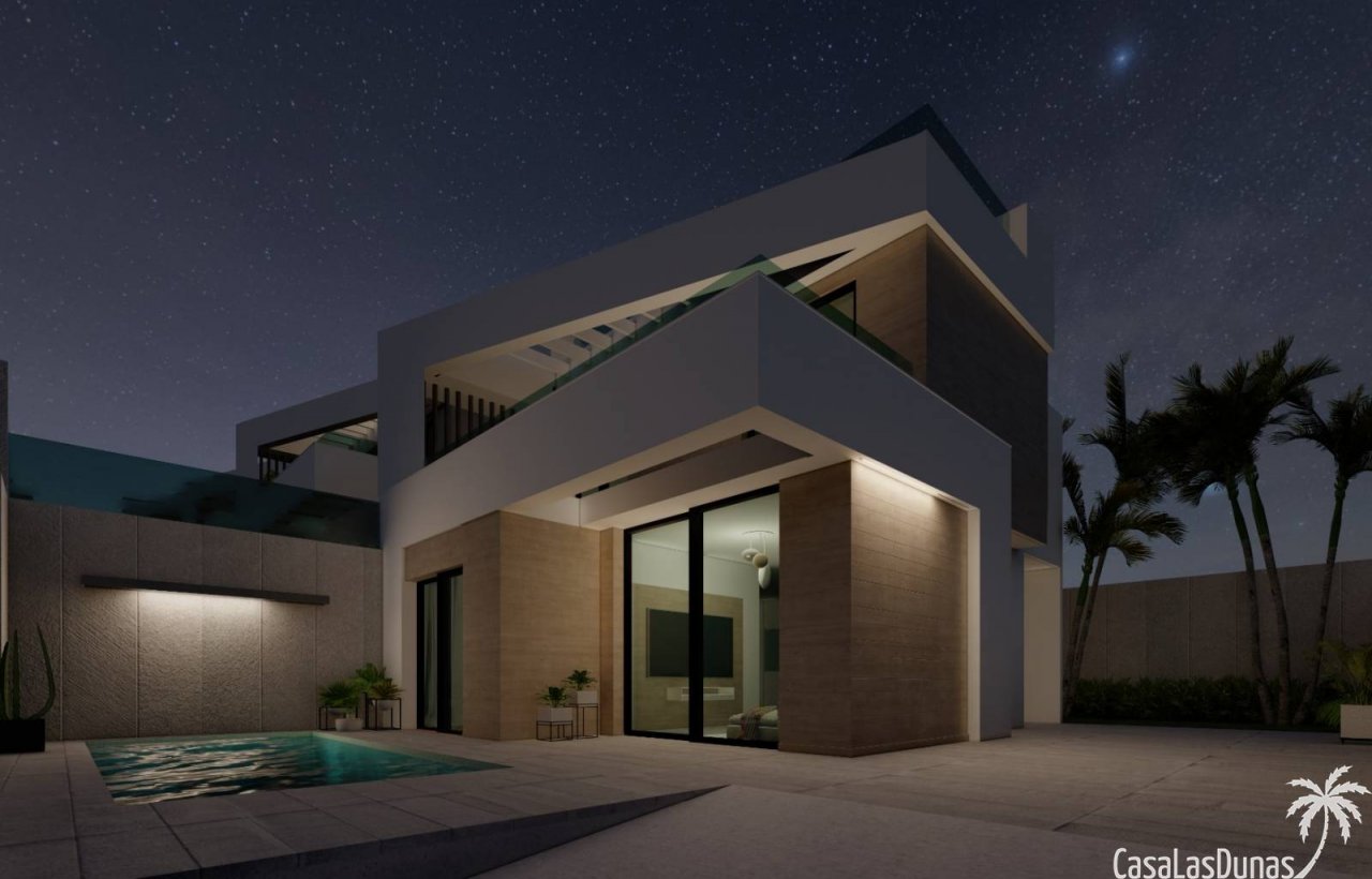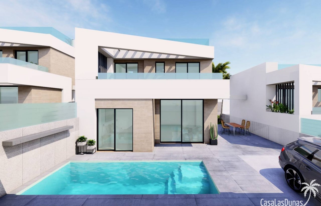 Von der ersten Etage führt eine Außentreppe zur Dachterrasse (36 m²). Alle Häuser sind mit einem 2,5 x 6 Meter großen Swimmingpool mit Wärmepumpenaufbereitung ausgestattet. Alle 3 Badezimmer verfügen über Fußbodenheizung und auf beiden Etagen sind vollklimatisierte Geräte installiert. Die Bauzeit dieser Villen beträgt ca. 12 bis 14 Monate nach Unterzeichnung des Kaufvertrages. Bitte kontaktieren Sie uns für weitere Informationen.