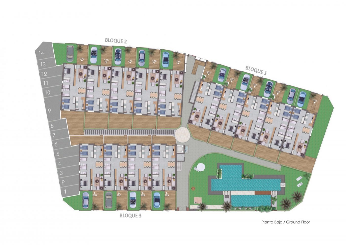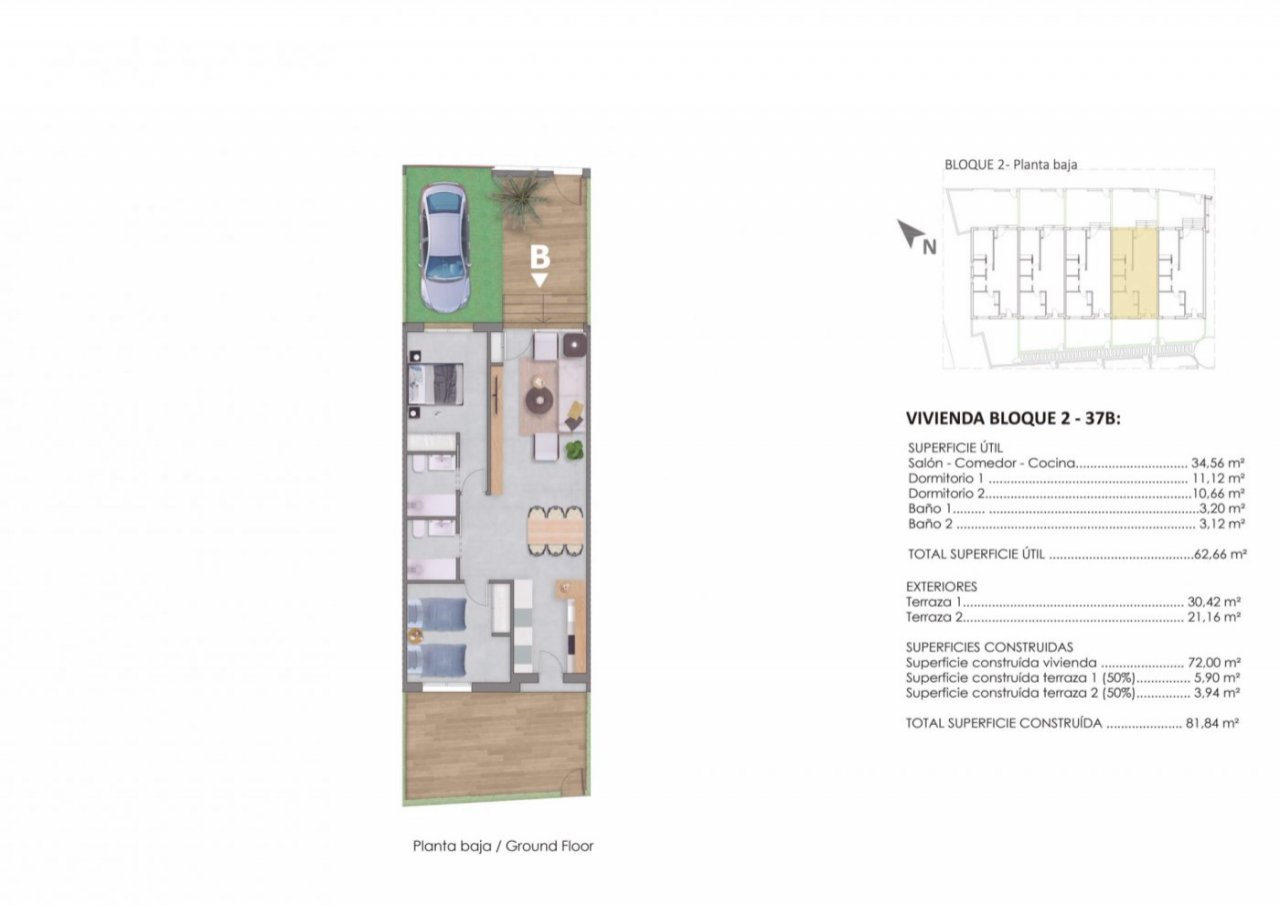 Dieses 81m2 Apartment im Erdgeschoss besteht aus 2 Schlafzimmern, 2 Badezimmern mit einer privaten Terrasse von 30m2 und einem Garten von 21m2. Die Wohnanlage verfügt über einen Gemeinschaftspool und einen Parkplatz.
