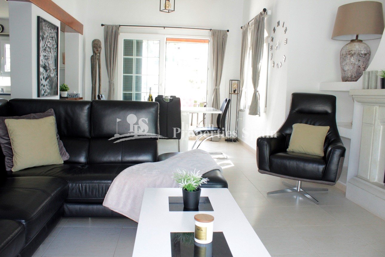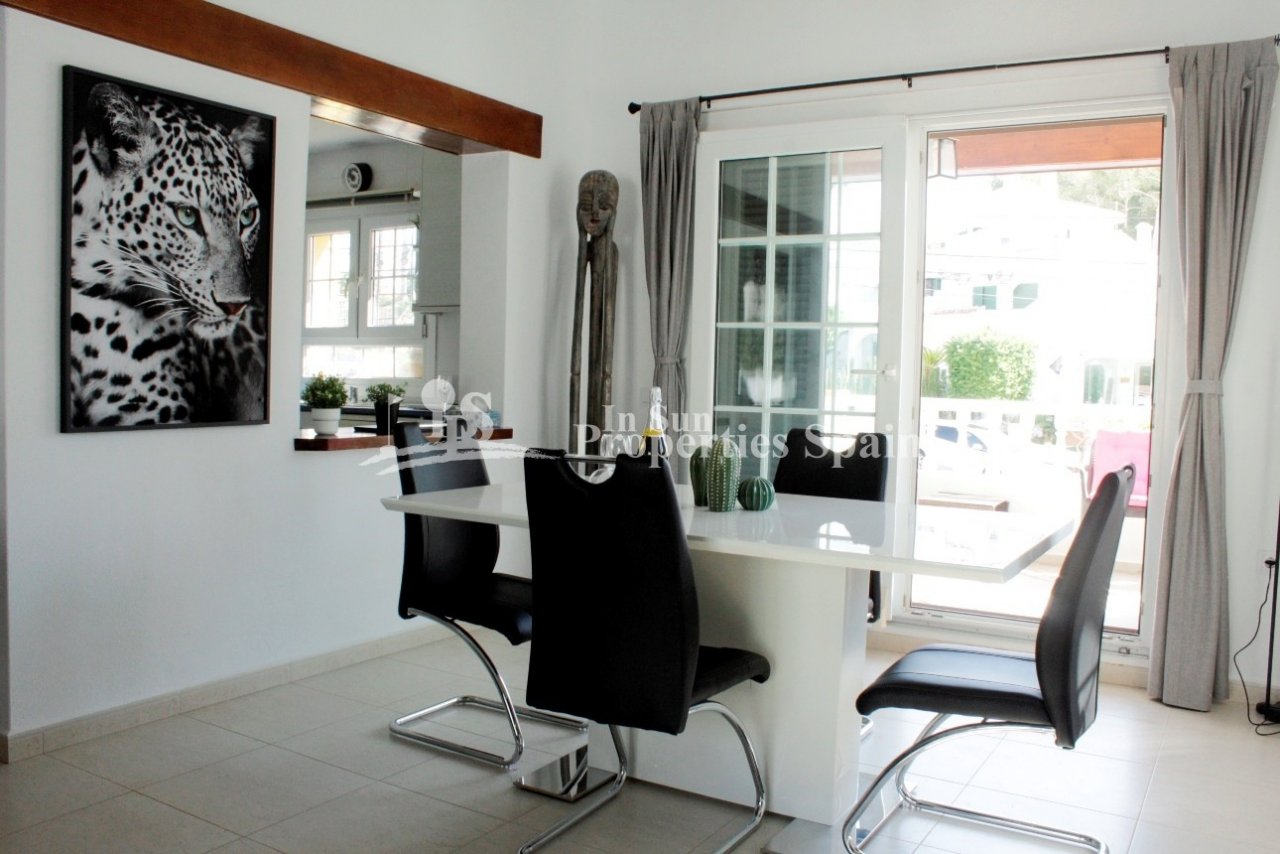 Die Villa verfügt über drei Doppelschlafzimmer mit Einbauschränken und drei Badezimmer, darunter ein En-Suite-Badezimmer mit Zugang zu einer überdachten Terrasse mit Blick auf den Garten und den Pool. Das Erdgeschoss bietet einen einladenden Eingangsbereich mit überdachter Terrasse, einen geräumigen Flur, ein Gästebad mit Dusche, eine separate, voll ausgestattete Küche und einen hellen Wohn-Essbereich mit hohen Gewölbedecken, einem Kamin und Fenstertüren, die auf einen großen Balkon mit freiem Blick führen. Eine Außentreppe führt zu einer Dachterrasse, die sich ideal zum Sonnenbaden und Genießen des Panoramablicks eignet. Zur weiteren Ausstattung gehören eine Klimaanlage, doppelt verglaste Fenster, Rollläden, eine Alarmanlage und ein Gas-Kamin für die kühleren Monate.