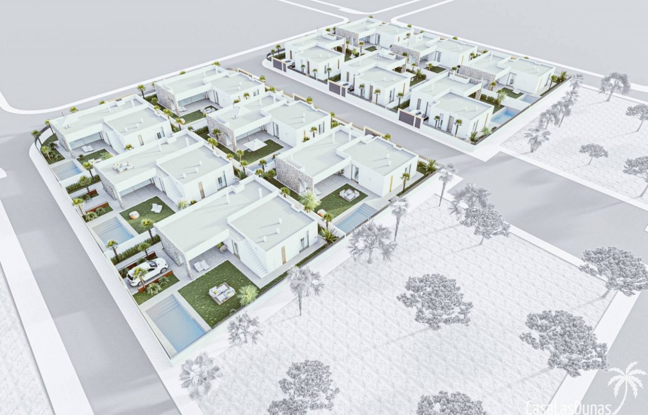 Wunderschöne Villen in Mar de Cristal mit 3 Schlafzimmern und 2 Bädern. Die Häuser haben ein modernes Aussehen kombiniert mit natürlichen Elementen. Ein privater Swimmingpool darf natürlich nicht fehlen und Ihr Auto können Sie auf dem eigenen umzäunten Grundstück parken. Durch die großen Fenster im Wohnzimmer profitieren Sie von viel Tageslicht und Blick auf den Pool.