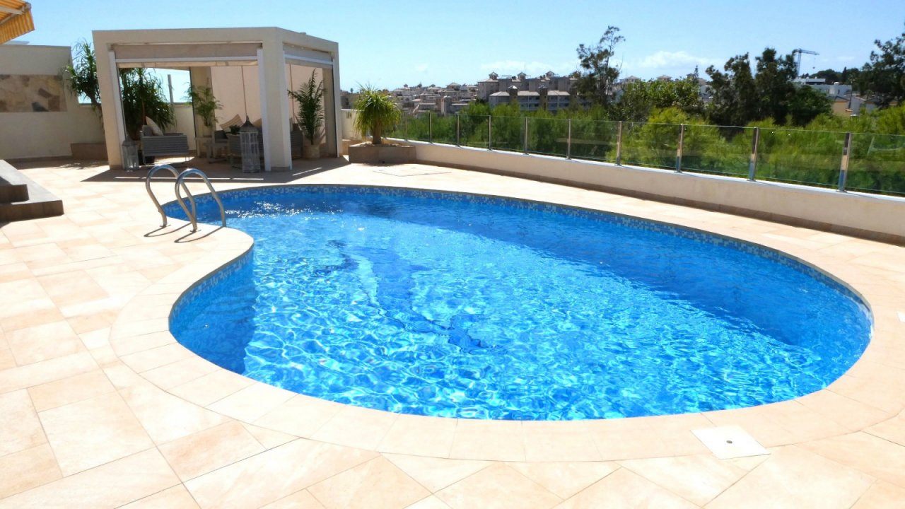Auf einem 374 m² großen, nach Südwesten ausgerichteten Grundstück gelegen, verfügt der Außenbereich über einen 8 × 4 m großen privaten Pool, eine Außendusche, eine Pergola mit Markisen und einen wunderschön gepflegten, pflegeleichten Garten mit einer Mischung aus Fliesen und Pflanzen.