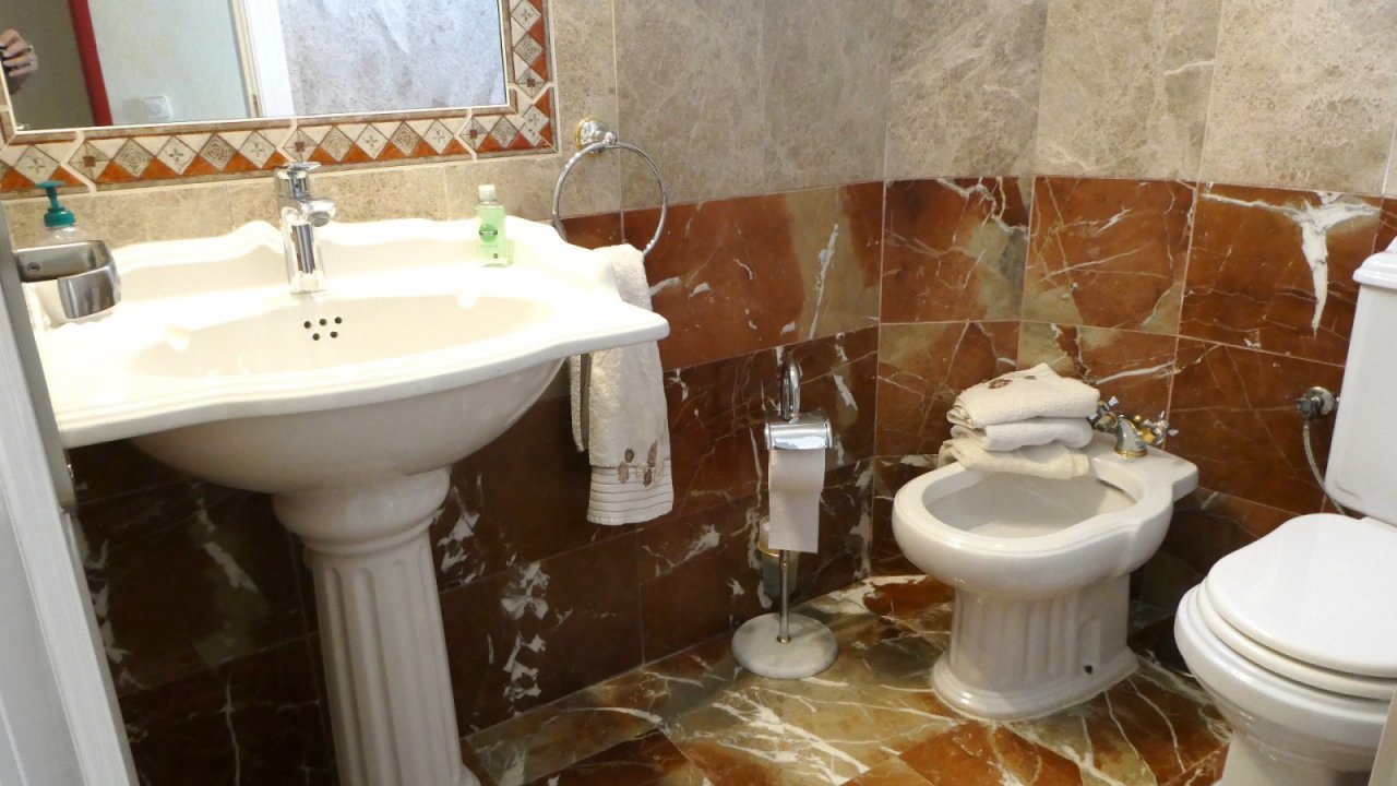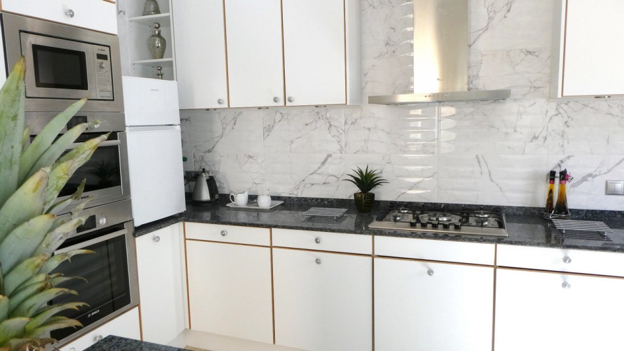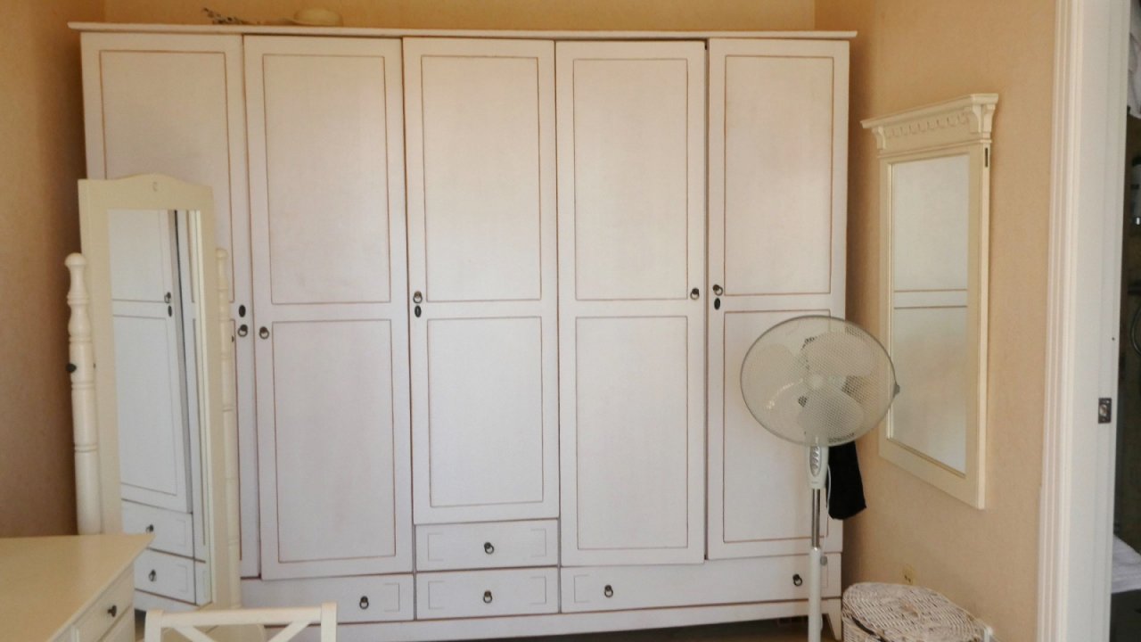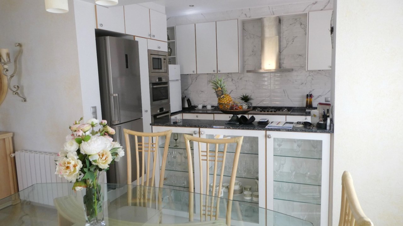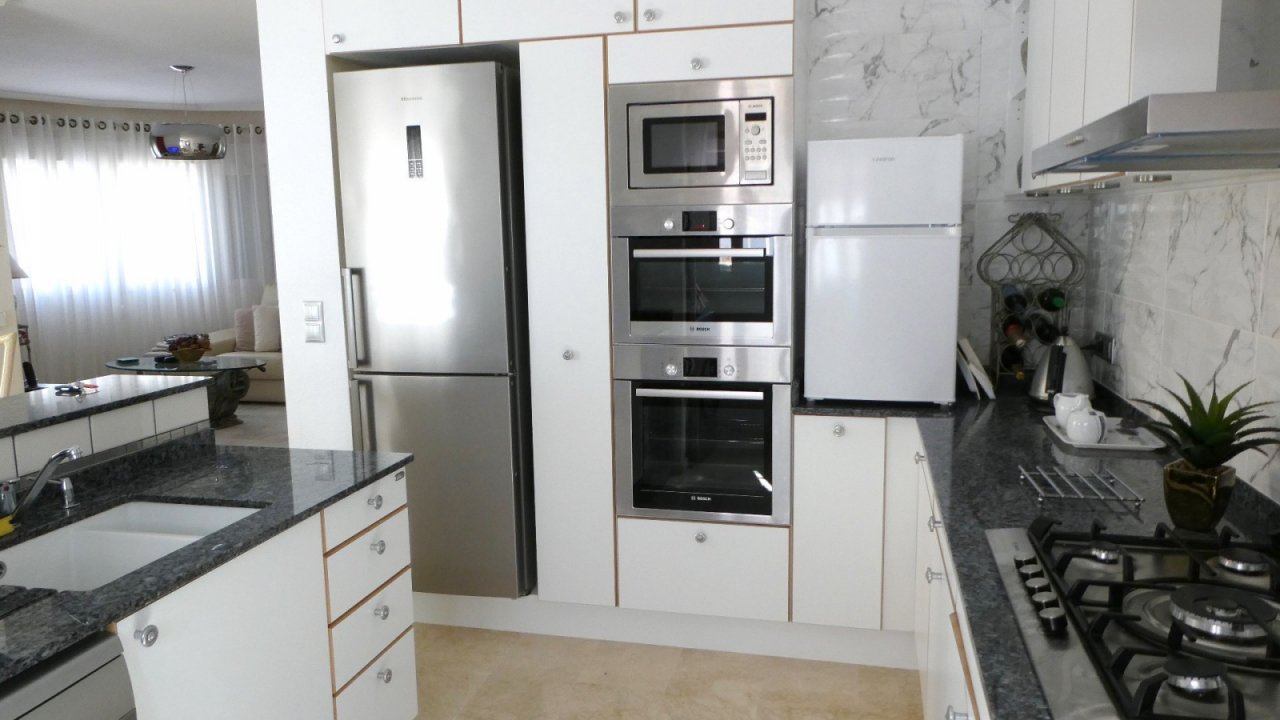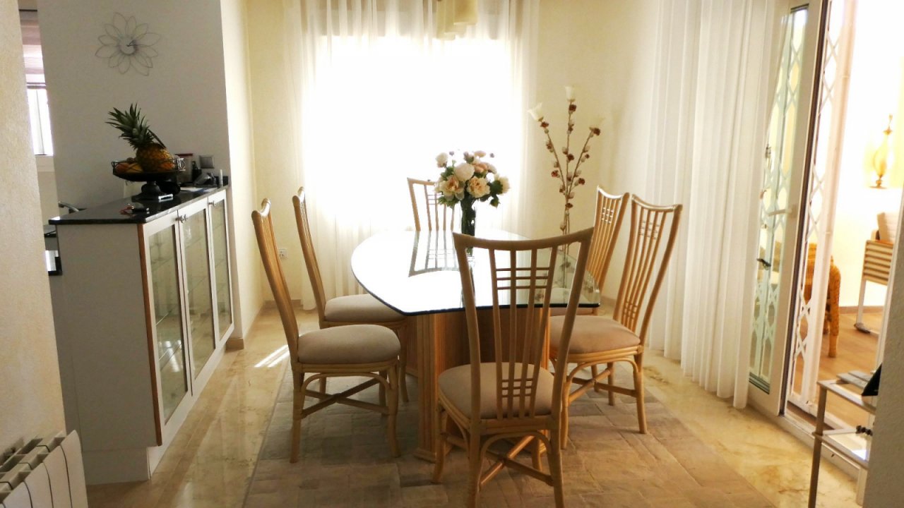 Die Villa verfügt über einen geräumigen Wohn- und Essbereich mit einem Gaskamin, eine moderne, 2022 eingebaute offene Küche, vier großzügige Schlafzimmer, zwei Badezimmer und eine Gästetoilette. Vom Hauptwohnbereich aus hat man Zugang zu einer 14,5 m² großen Terrasse mit elektrischen Markisen, die sich ideal zum Entspannen im Freien eignet. Das 13 m² große Solarium im ersten Stock bietet zusätzlichen privaten Raum, um die Sonne zu genießen.