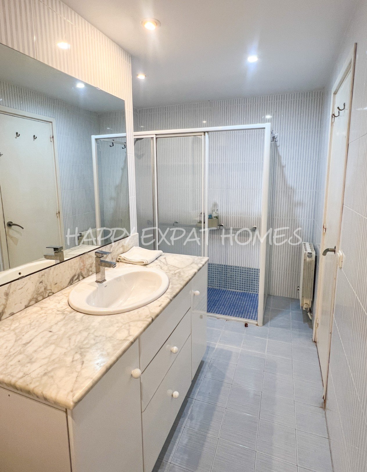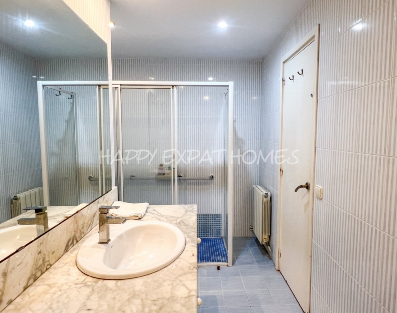 Die Wohnung befindet sich im ersten Stock eines Gebäudes mit Aufzug und verfügt über drei Doppelzimmer mit eingebauten Kleiderschränken, einen großen Wohn- und Essbereich mit Zugang zu einem Balkon, der zu einem ruhigen Innenhof blickt, und eine voll ausgestattete getrennte Küche. Das Badezimmer beinhaltet eine großzügige begehbare Dusche, und es gibt außerdem einen separaten Hauswirtschaftsraum mit einer Waschmaschine.