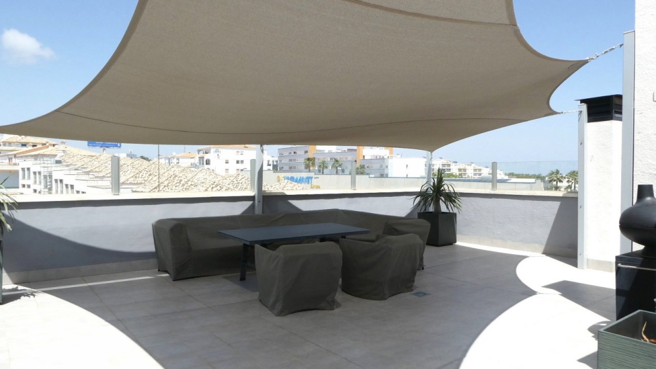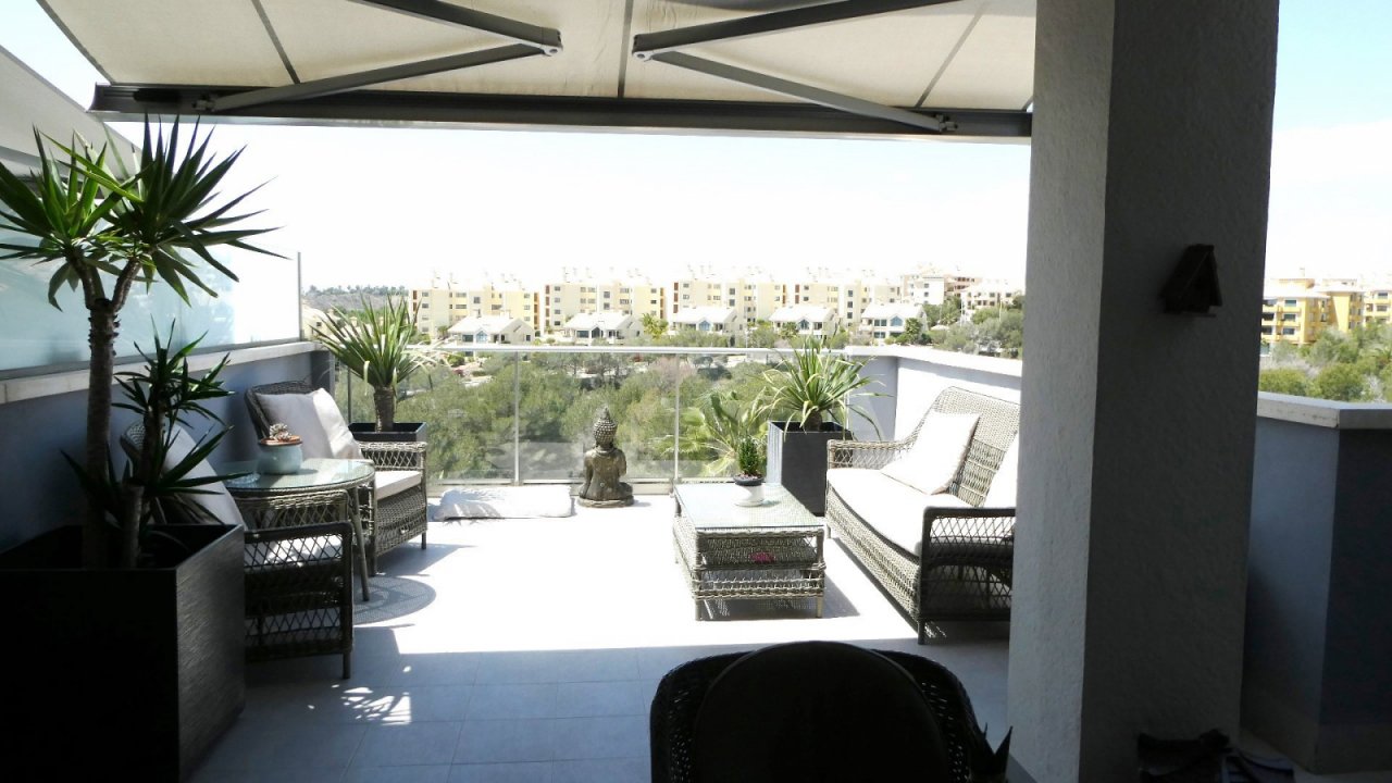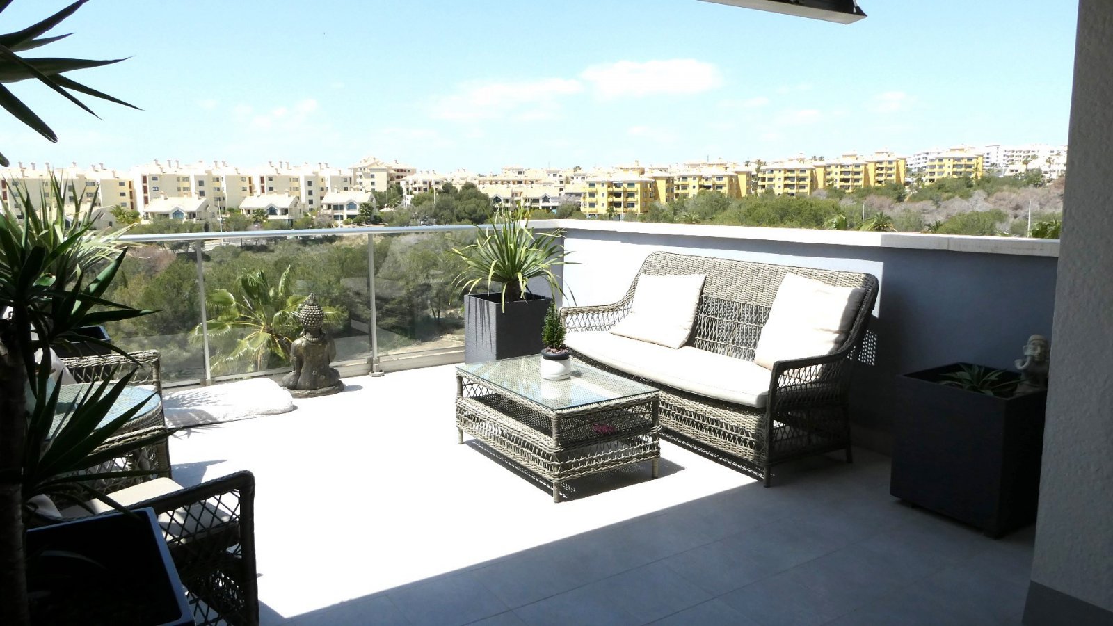 Dieses atemberaubende, moderne und außergewöhnlich geräumige, komplett möblierte Penthouse-Apartment befindet sich in einer exklusiven, wenig bebauten Wohnanlage in Laufnähe zum Einkaufszentrum La Fuente in Orihuela Costa an der Costa Blanca Süd.