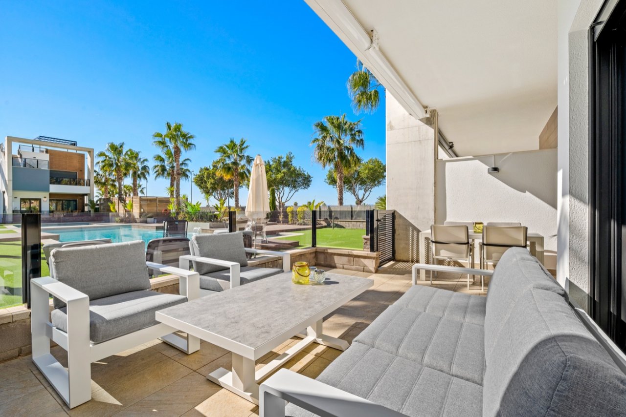 This beautiful south-facing ground-floor apartment is located in a modern residential complex in El Raso , Guardamar del Segura. The apartment features two bedrooms , two bathrooms , and a spacious, open-plan living room with kitchen, which opens onto a beautiful south-facing terrace overlooking the pool. The entire apartment is equipped with a central air conditioning system. The apartment is also equipped with mosquito nets and a large awning that shades the entire terrace, allowing you to fully enjoy both indoor and outdoor living. Thanks to its small-scale character (only 31 homes), you can enjoy the facilities here in peace and quiet.